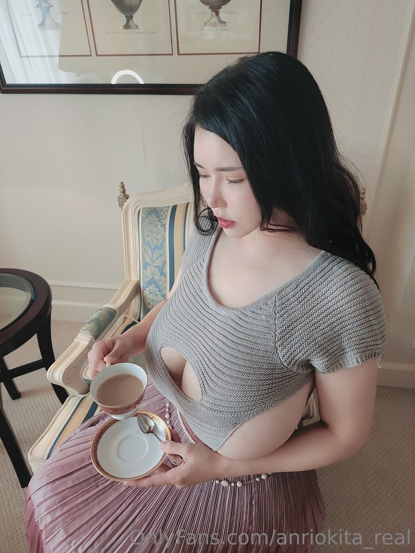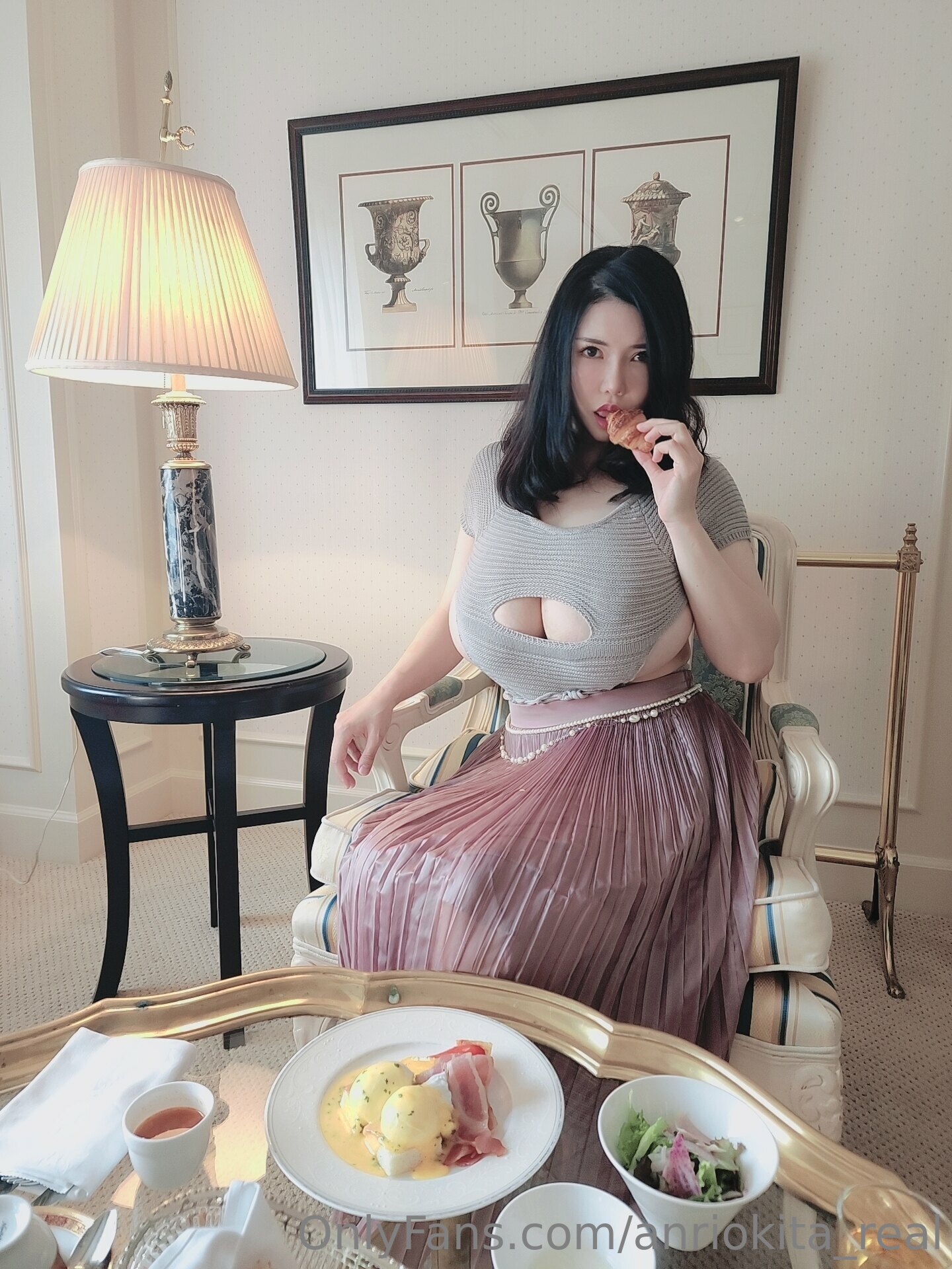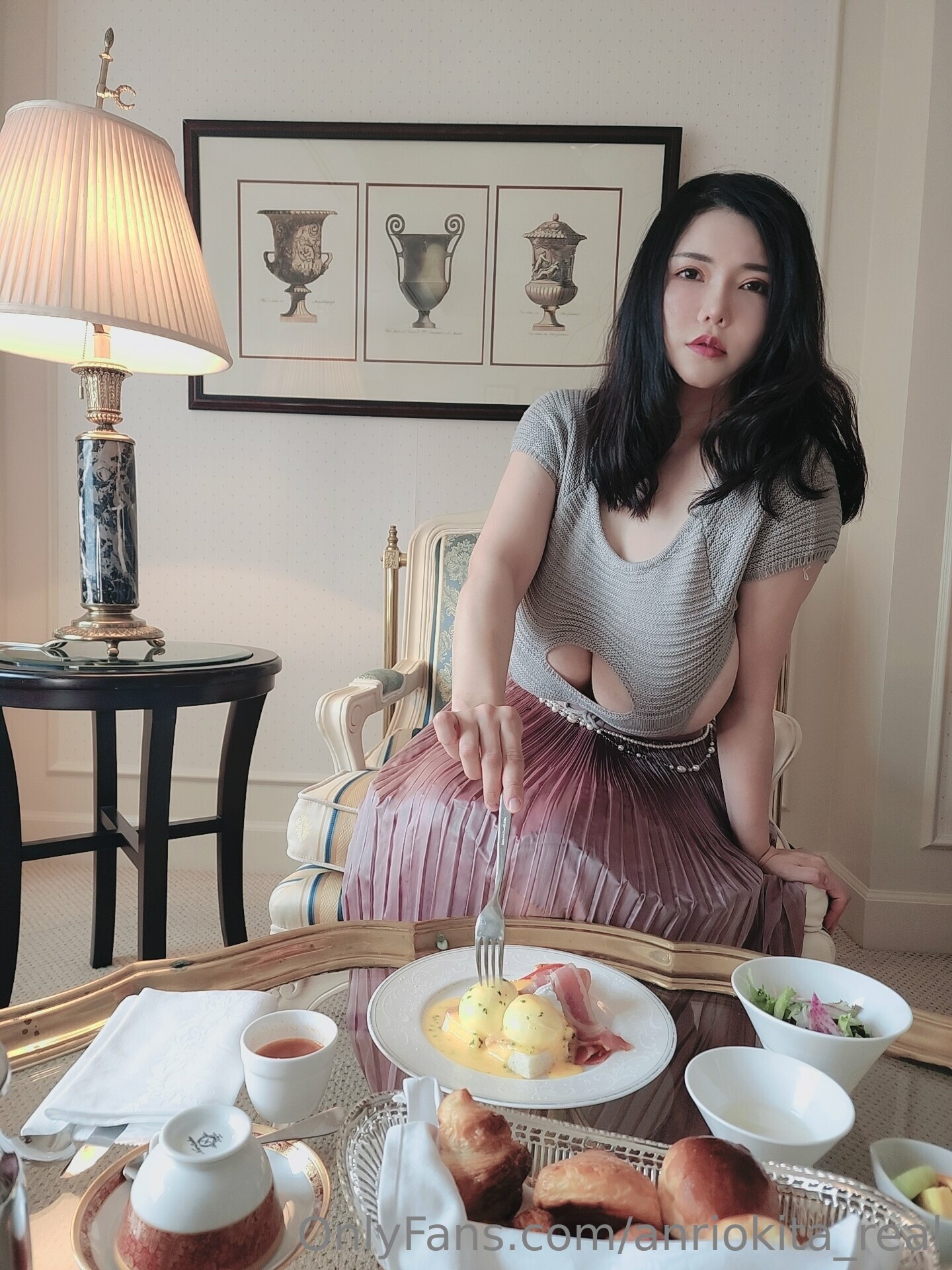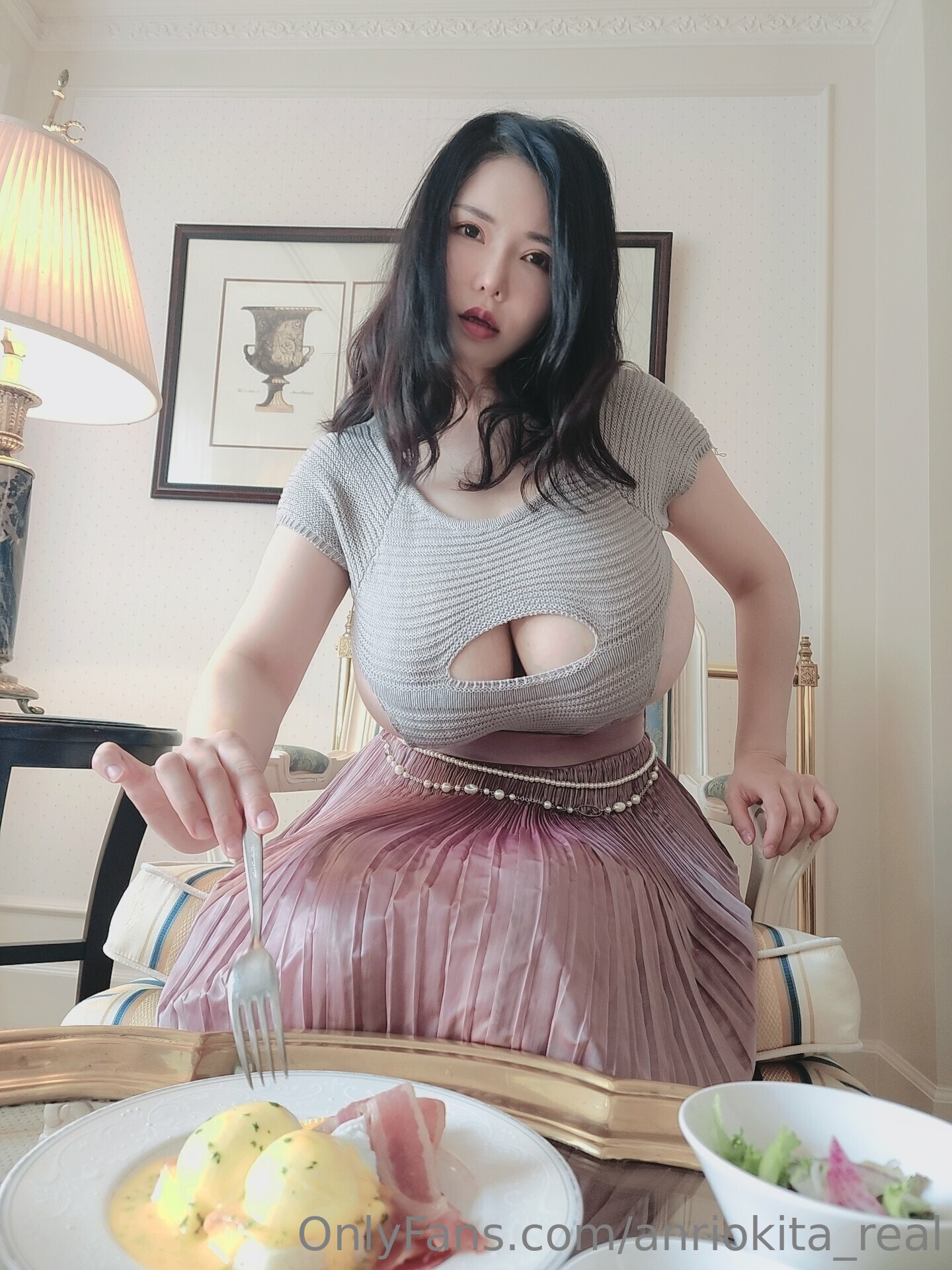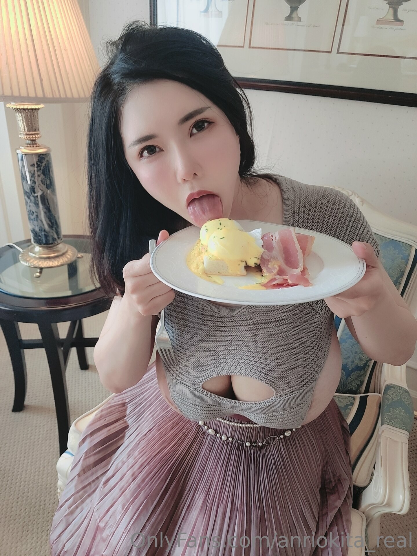 This is a photo set of Anri Okita having brunch meal then pour butter & cream on her nipples.