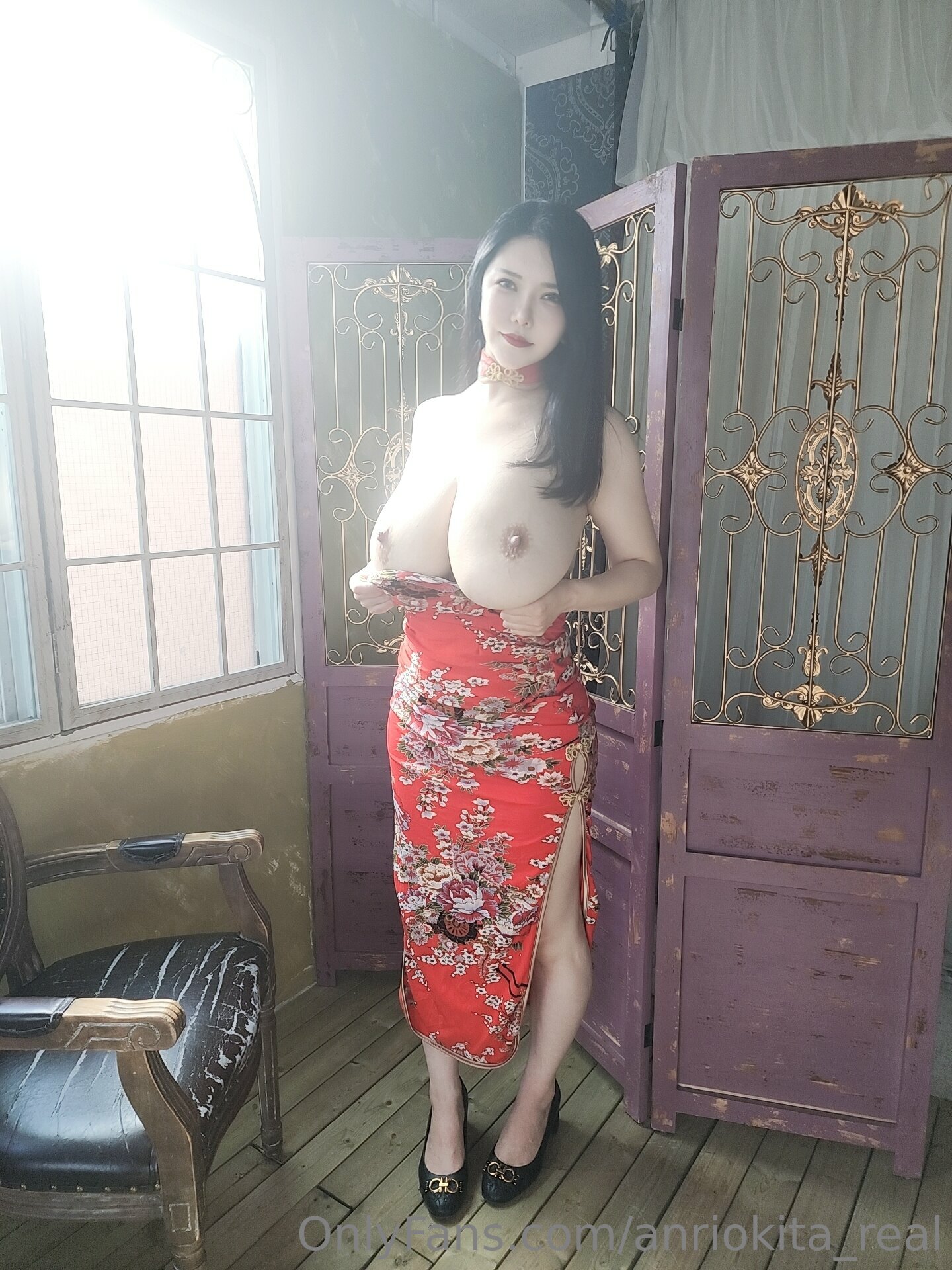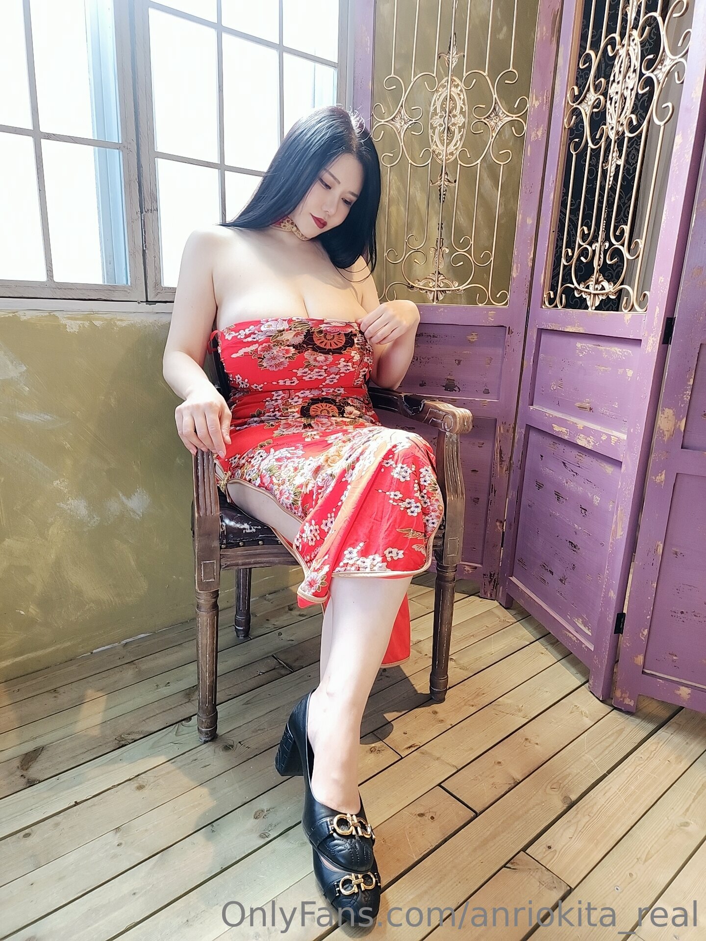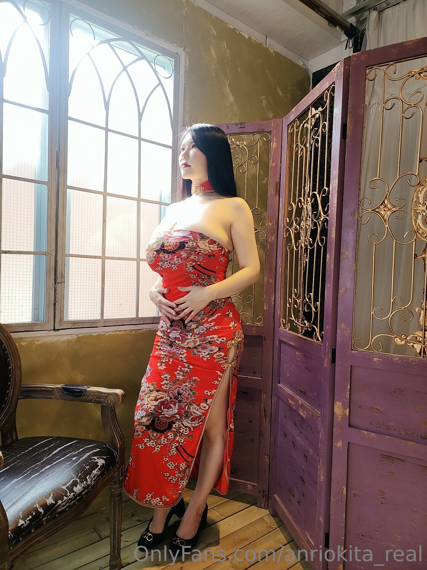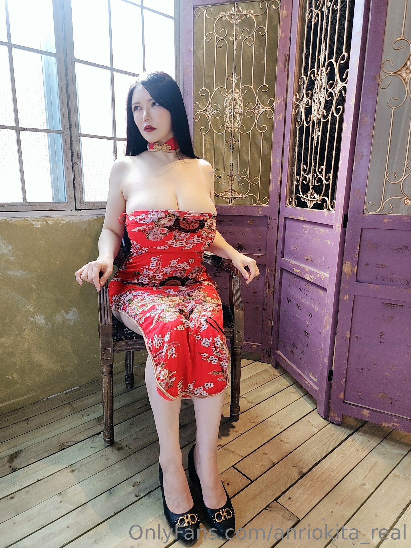 This is a photo set of Anri Okita wearing a red chinese dress (cheongsam).