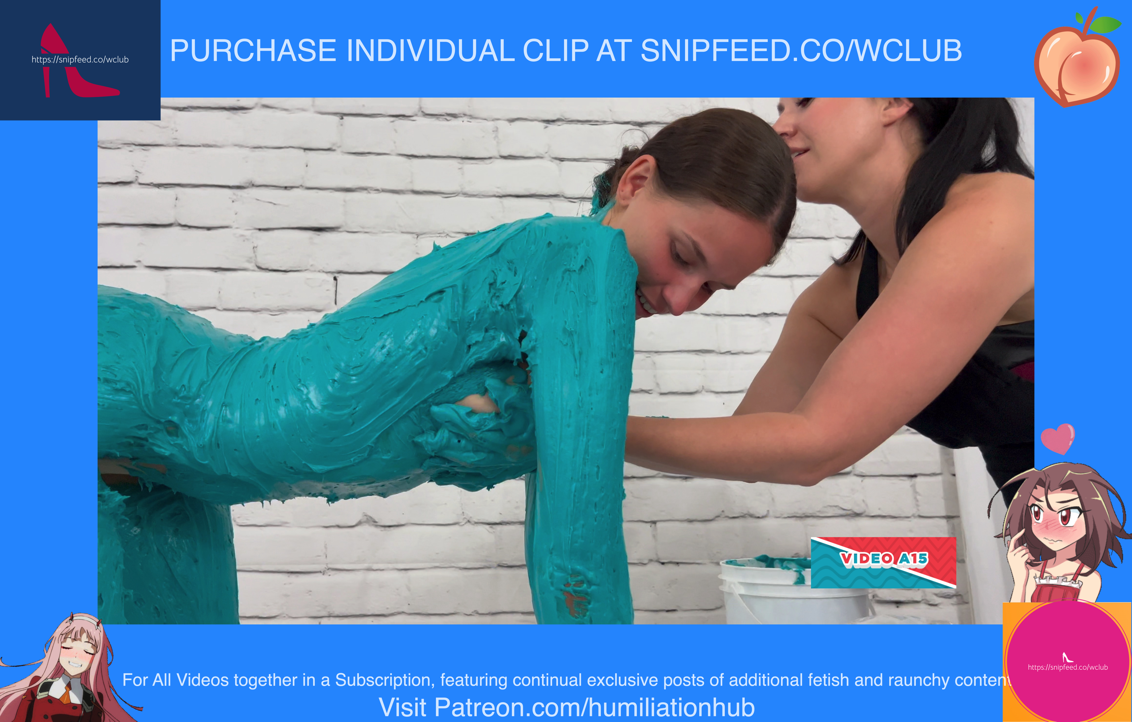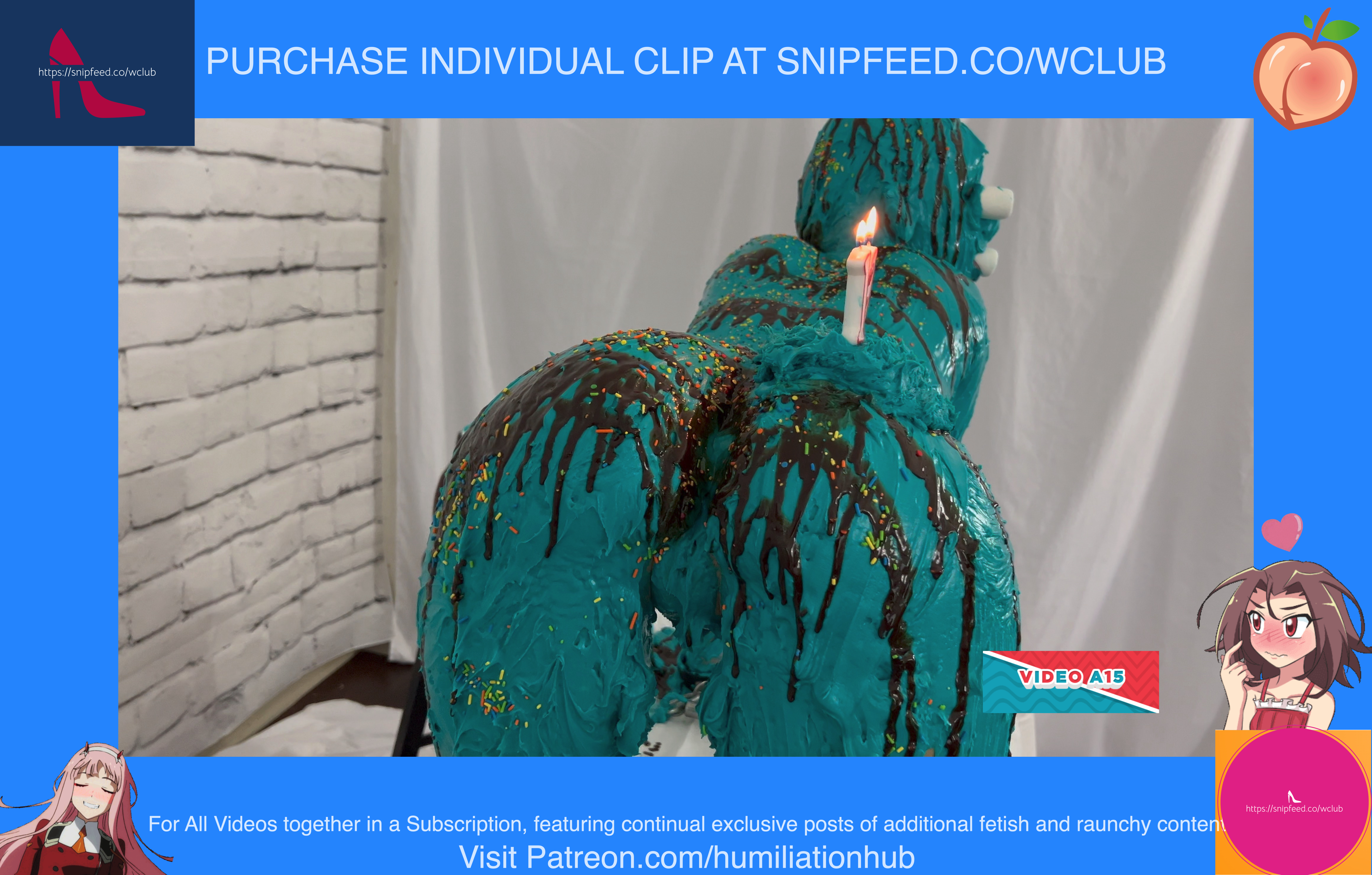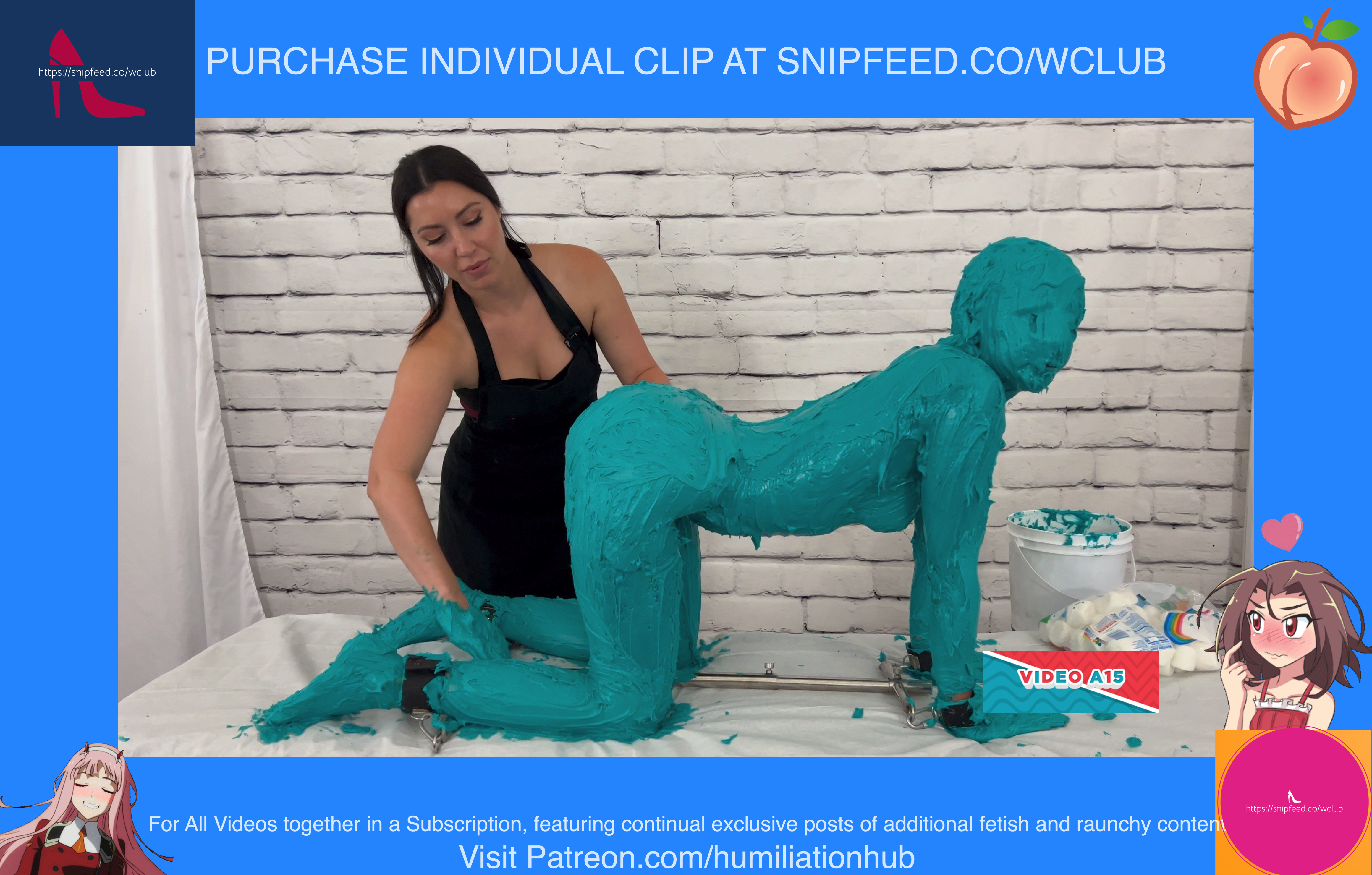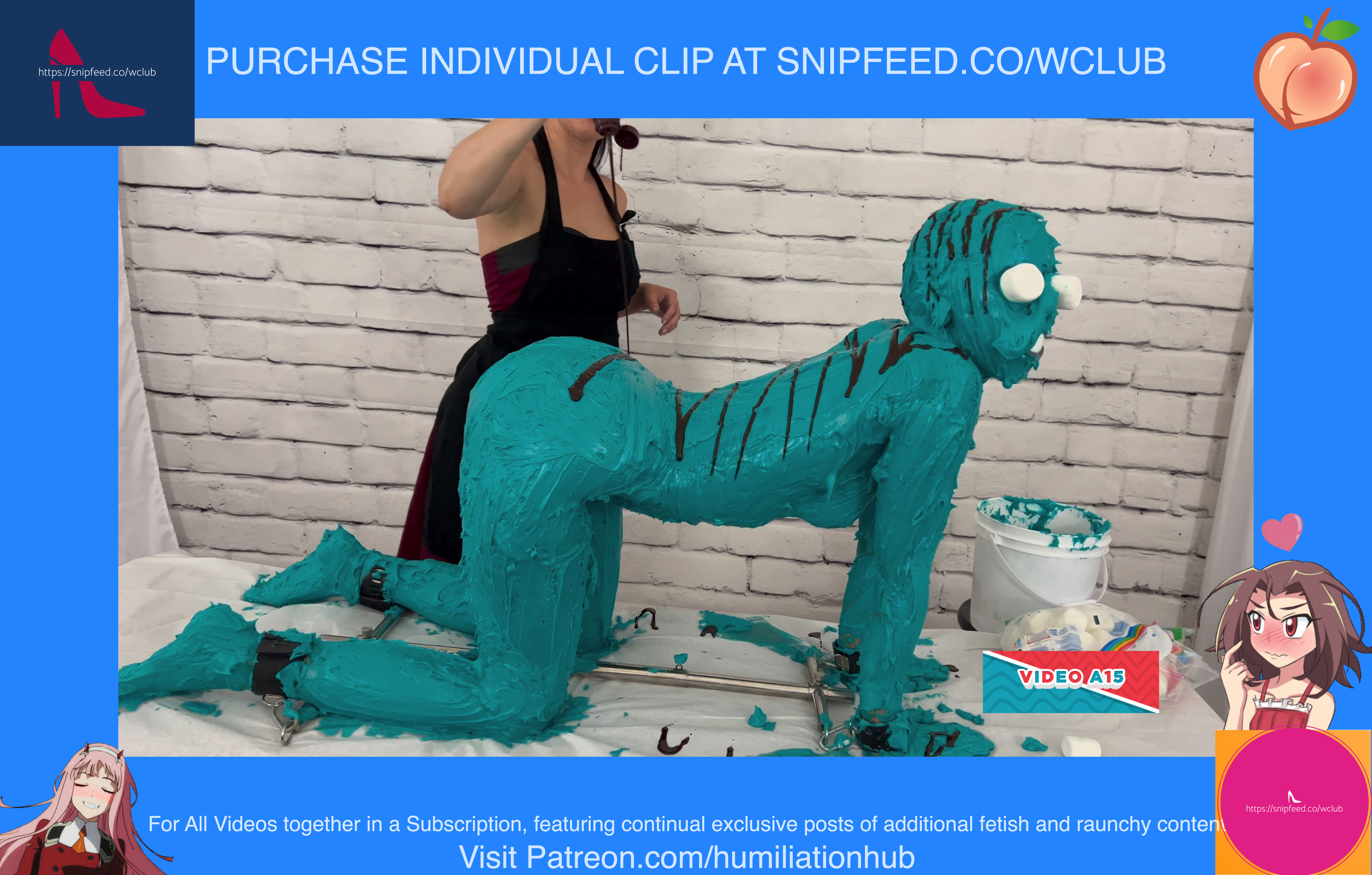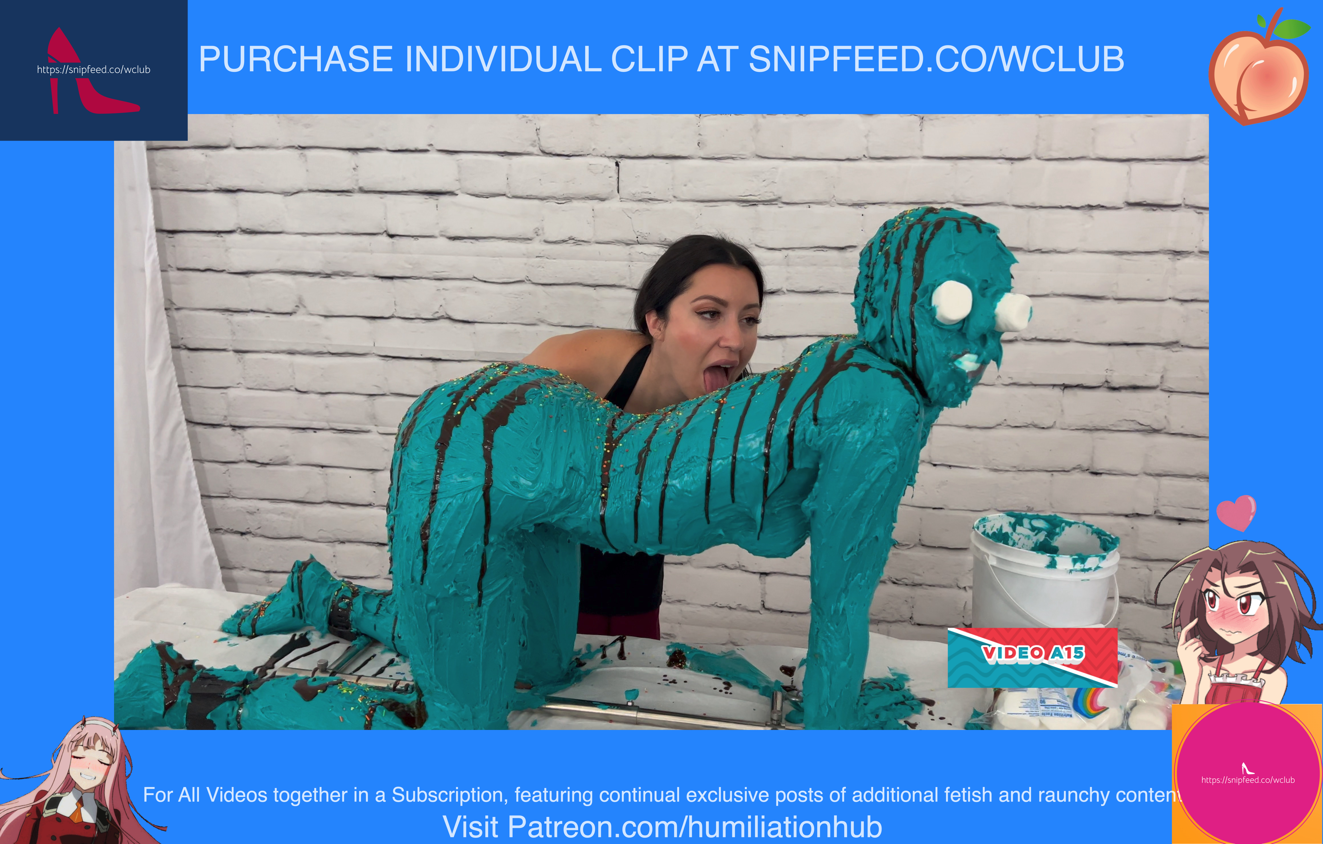 Dakota is 19 years old and wants to ring in the new year in style. We set up a human birthday cake for her and Maria is on hand to make it happen. We strip Dakota naked and put her in the bondage shackle while sheโs on all 4s. Sheโs then covered from head to toe with buttercream frosting and Maria makes sure she gets every inch of her sexy body during the process. She adds sprinkles, chocolate drizzles, marshmallow eyes, and a stuffed mouth full of marshmallows before finishing off with age 19 birthday candles on her butt. Happy birthday Dakota!