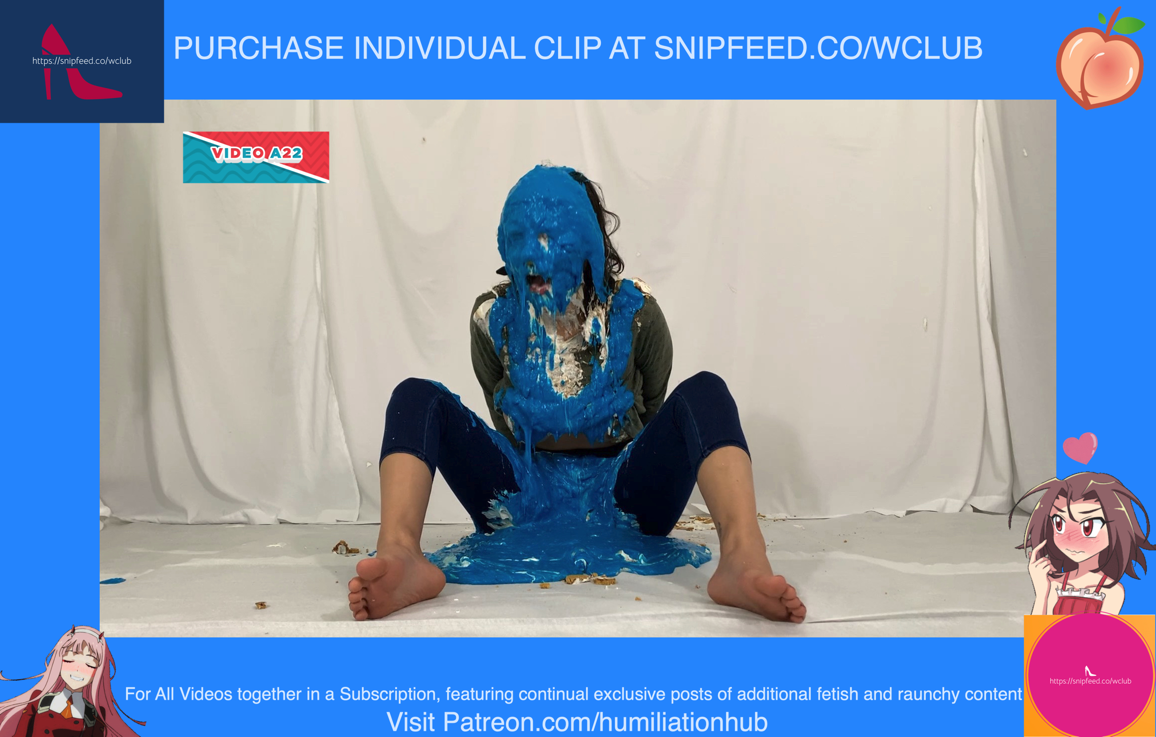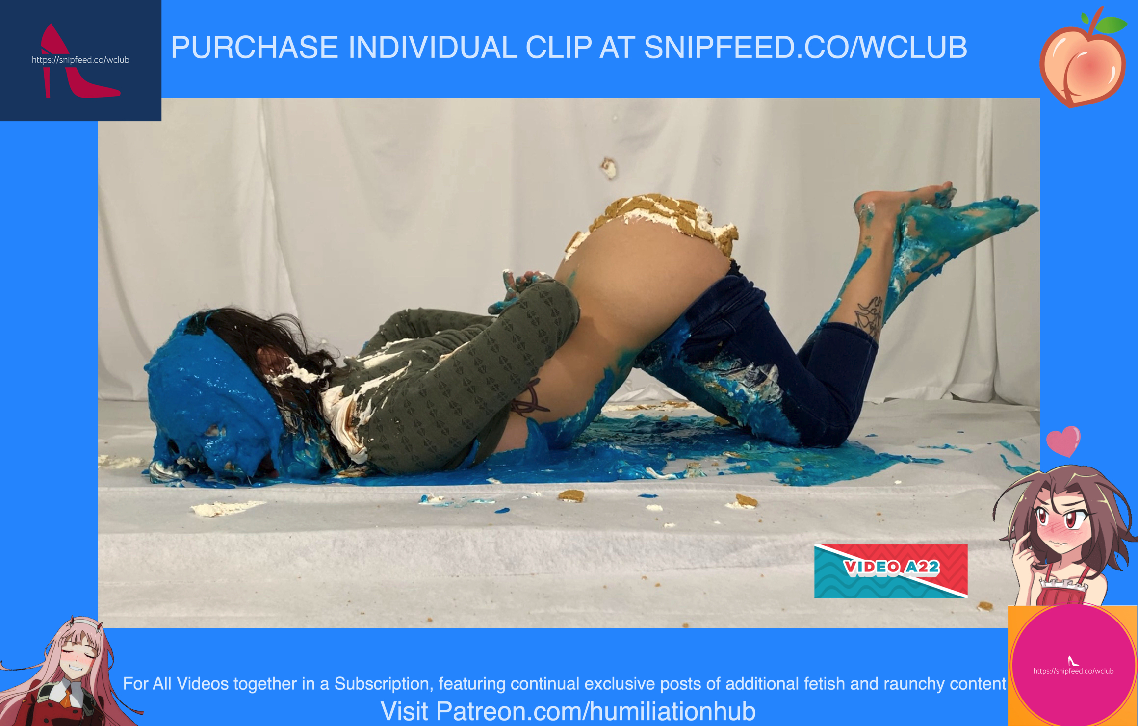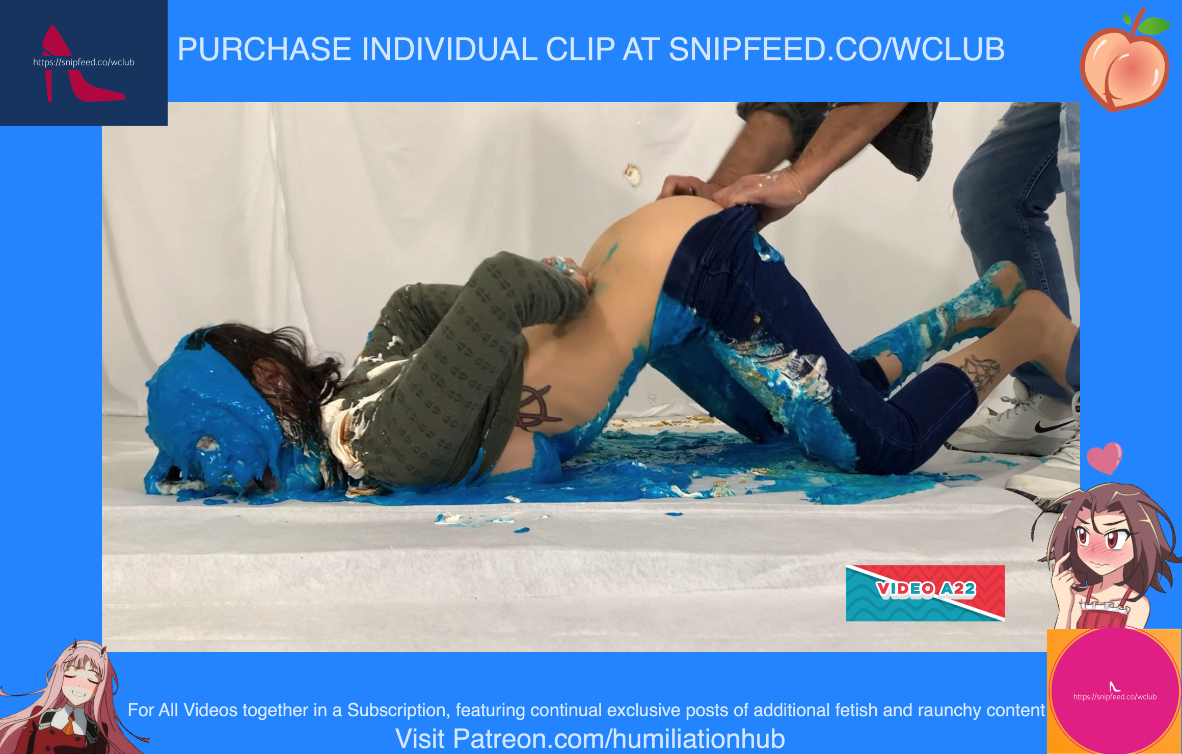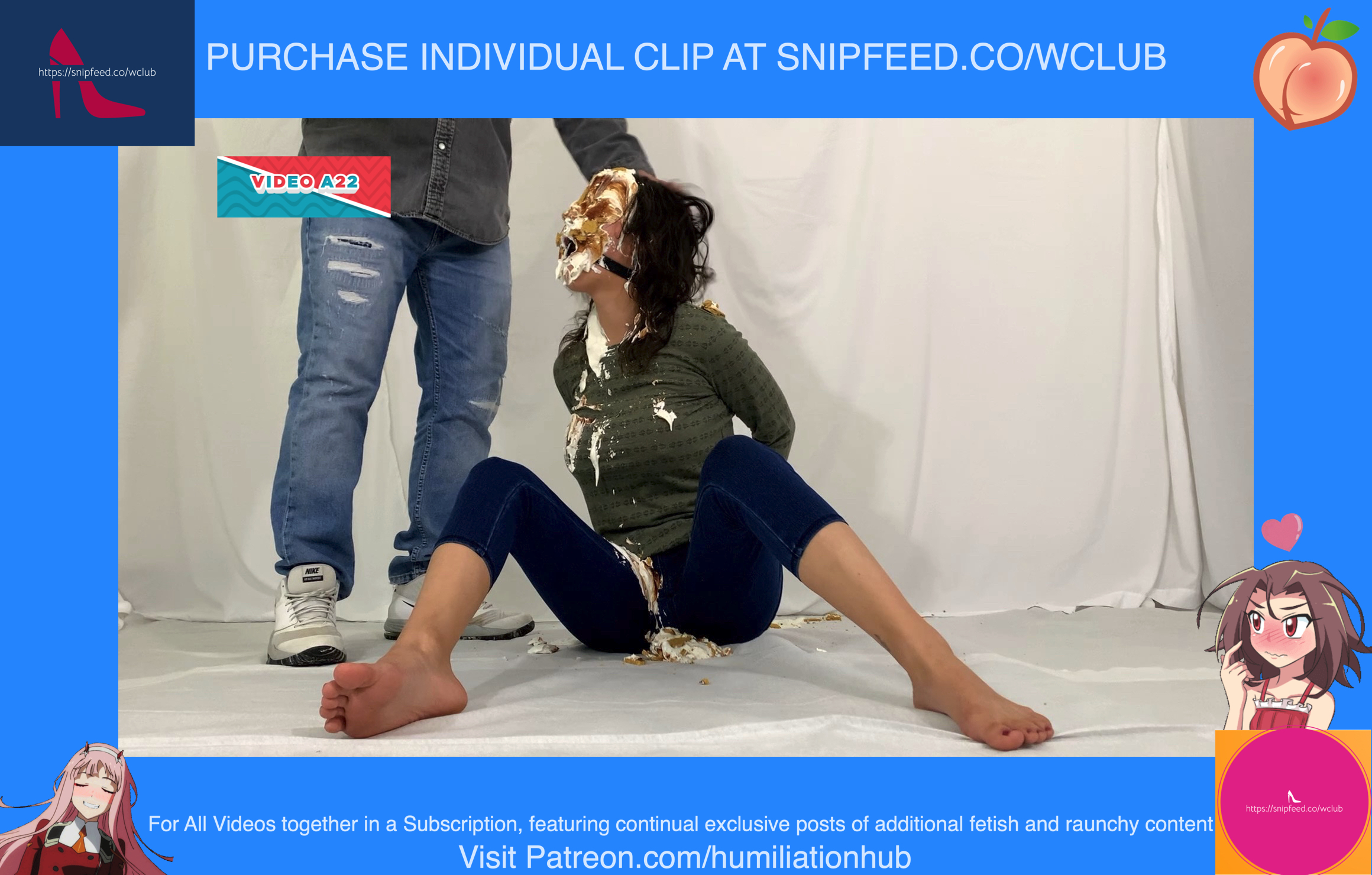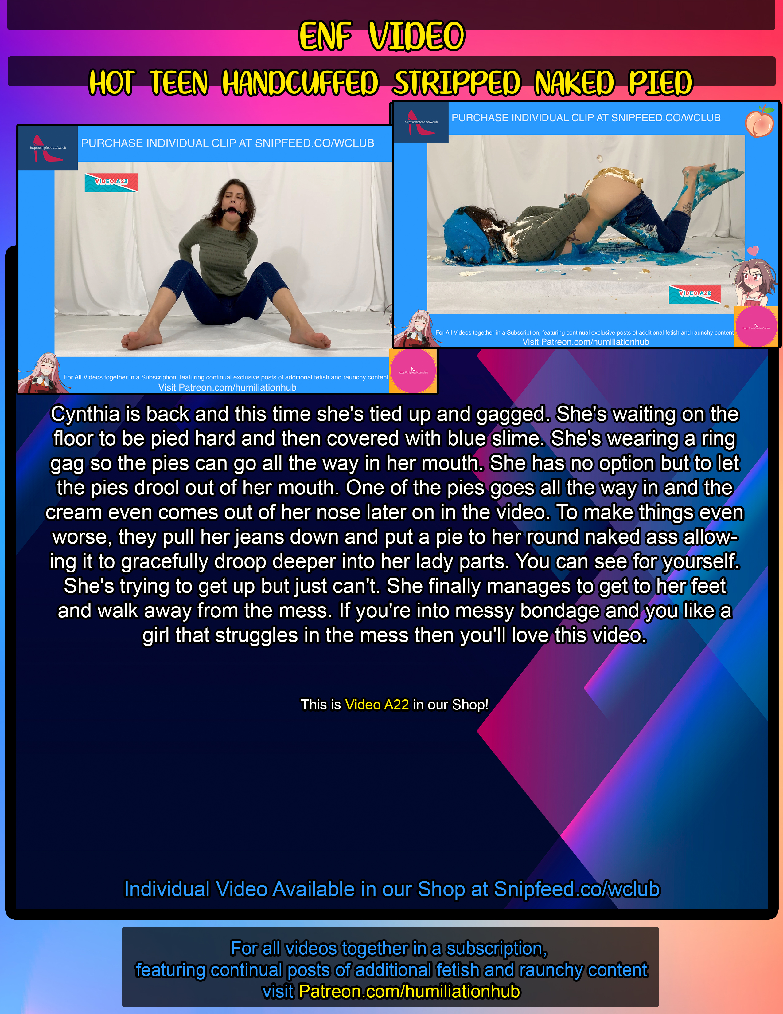 Cynthia is back and this time she's tied up and gagged. She's waiting on the floor to be pied hard and then covered with blue slime. She's wearing a ring gag so the pies can go all the way in her mouth. She has no option but to let the pies drool out of her mouth. One of the pies goes all the way in and the cream even comes out of her nose later on in the video. To make things even worse, they pull her jeans down and put a pie to her round naked ass allowing it to gracefully droop deeper into her lady parts. You can see for yourself. She's trying to get up but just can't. She finally manages to get to her feet and walk away from the mess. If you're into messy bondage and you like a girl that struggles in the mess then you'll love this video.