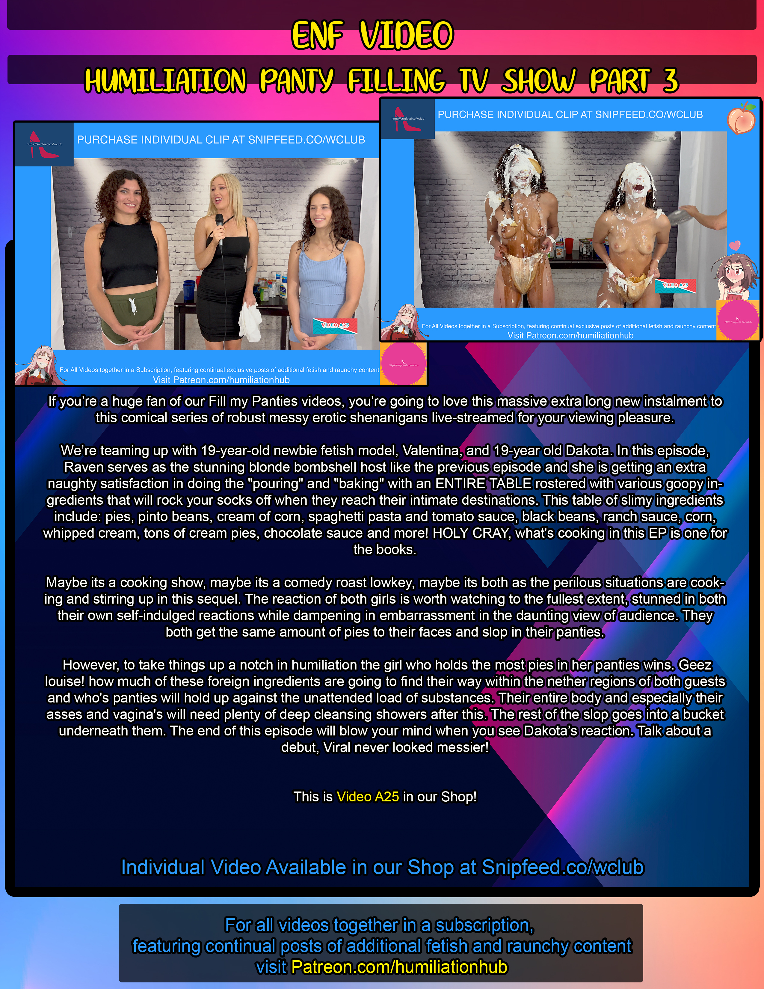 However, to take things up a notch in humiliation the girl who holds the most pies in her panties wins. Geez louise! how much of these foreign ingredients are going to find their way within the nether regions of both guests and who's panties will hold up against the unattended load of substances. Their entire body and especially their asses and vagina's will need plenty of deep cleansing showers after this. The rest of the slop goes into a bucket underneath them. The end of this episode will blow your mind when you see Dakota’s reaction. Talk about a debut, Viral never looked messier!